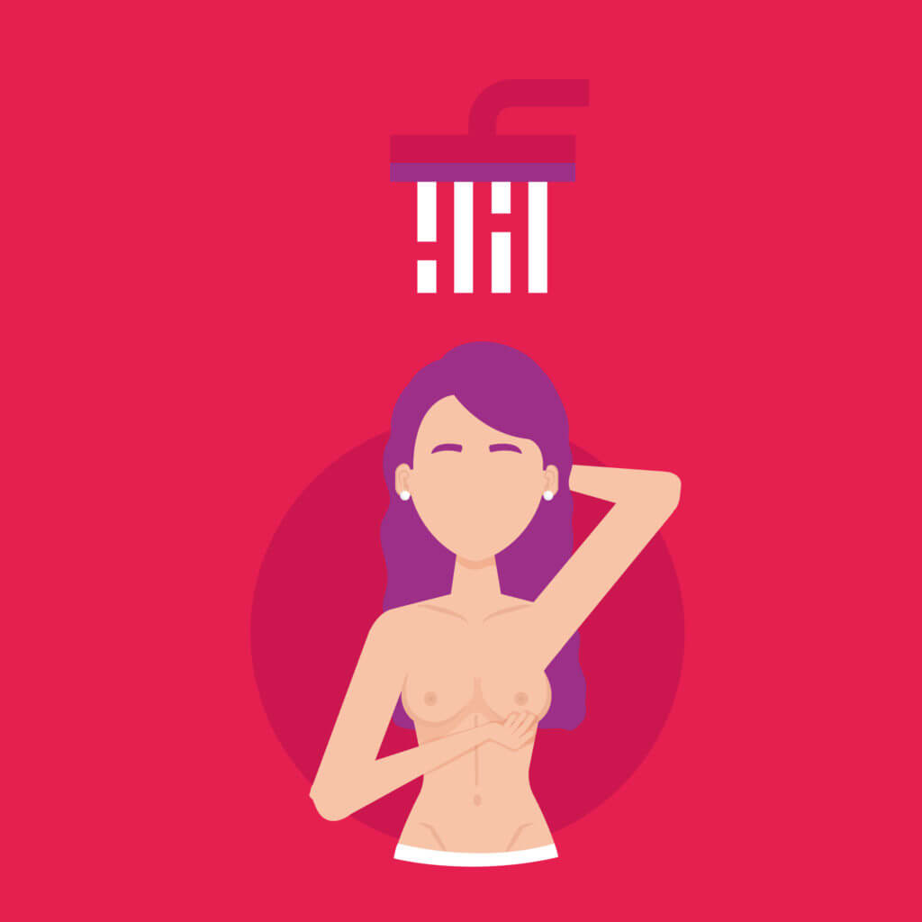 Ao tomar banho, verifique se há caroços ou endurecimento em suas mamas e axilas. Se as mãos estiverem ensaboadas deslizarão mais facilmente sobre a pele molhada. Examine suas mamas usando o mesmo procedimento que na posição deitada.